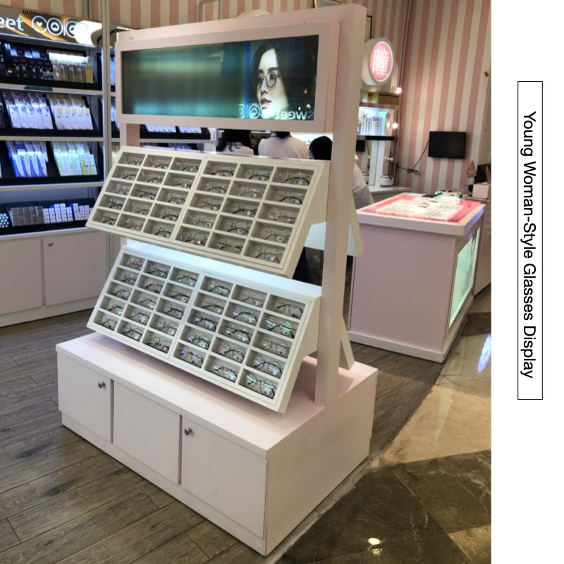 First of all, it is a feminine brand. The color displayed in the shop is feminine and pink, which is a kind of girl style. The top layer of this display shelf is a mirror, which is convenient for customers to see the effect immediately when trying on the glasses. At the bottom is the storage cabinet, which is very practical. You can put the glasses stock in it for easy access. In the middle of the cabinet are two layers, with each pair of glasses on display. This display cabinet is gondola cabinet, both sides are the same, make good use of space.