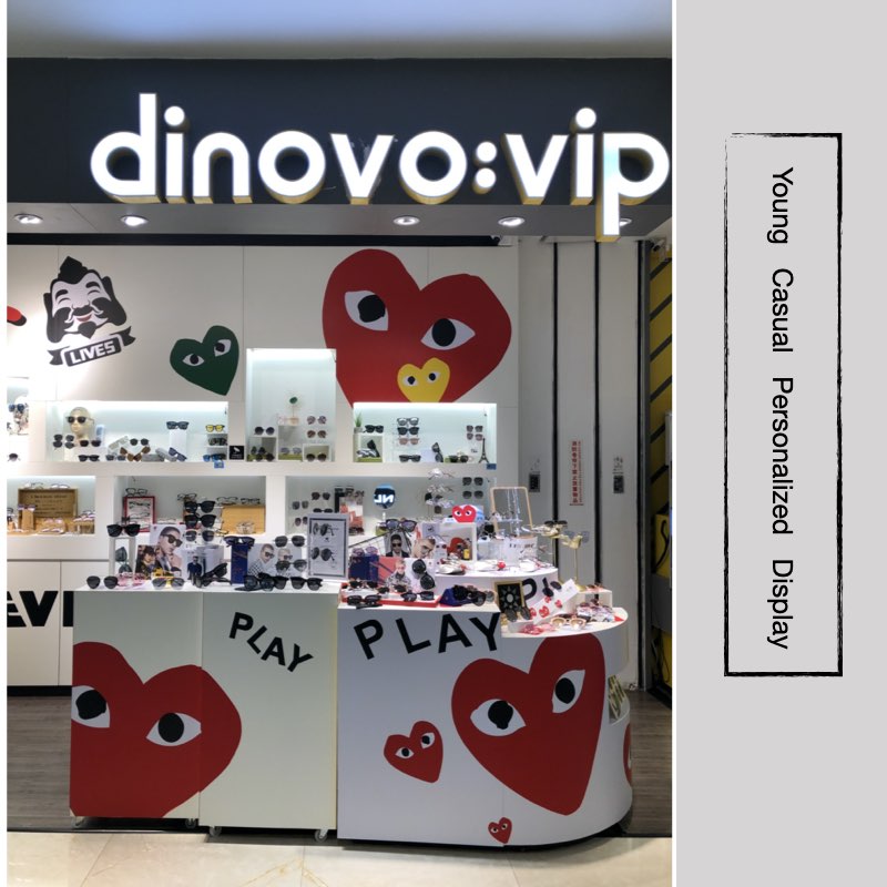 Another brand Dinovo, which looks more playful, is a showcase in white, with a large heart shape, and two eyes in the heart shape. The glasses are displayed on shelves with different heights, and the same are used to display glasses with different styles. On the whole, the display shows the impression that it is more personalized and looks like many styles. Such displays require customers to check them one by one, and it will take more time.