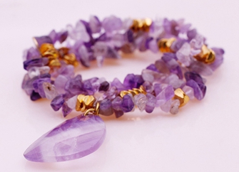 Amethyst is a violet quartz which is a semiprecious stone often used in jewelry and is the traditional birthstone for February. Amethyst is a purple variety of quartz (SiO2) and owes its violet color to irradiation, iron impurities (in some cases in conjunction with transition element impurities), and the presence of trace elements, which result in complex crystal lattice substitutions. The hardness of the mineral is the same as quartz, thus it is suitable for use in jewelry. But what making Amethyst popular in jewelry making is not its beautiful outside look, but its unique meaning and property.