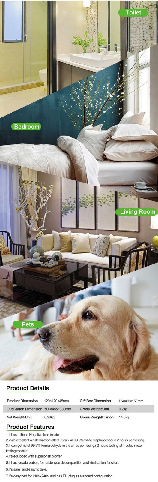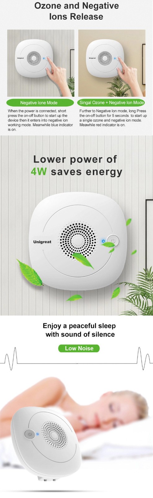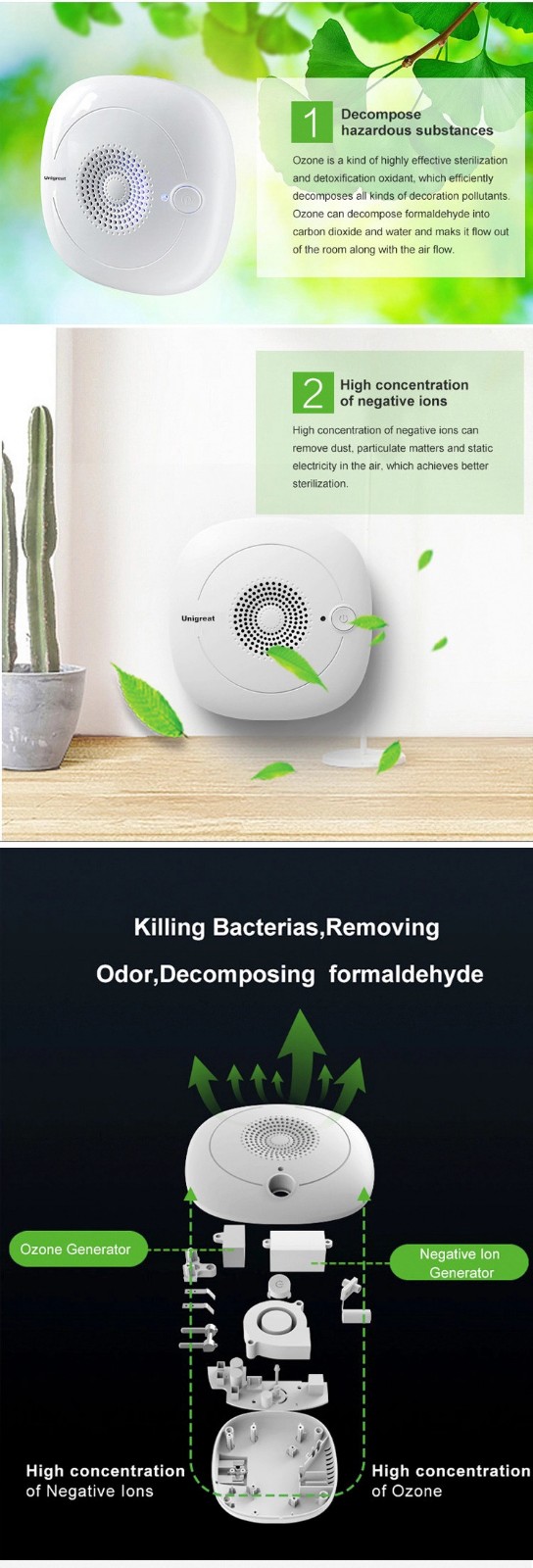 ⑵High concentration of negative ion : High concentration of negative icons can remove dust , particulate maters and static electricity in the air,which achieves better sterilization.