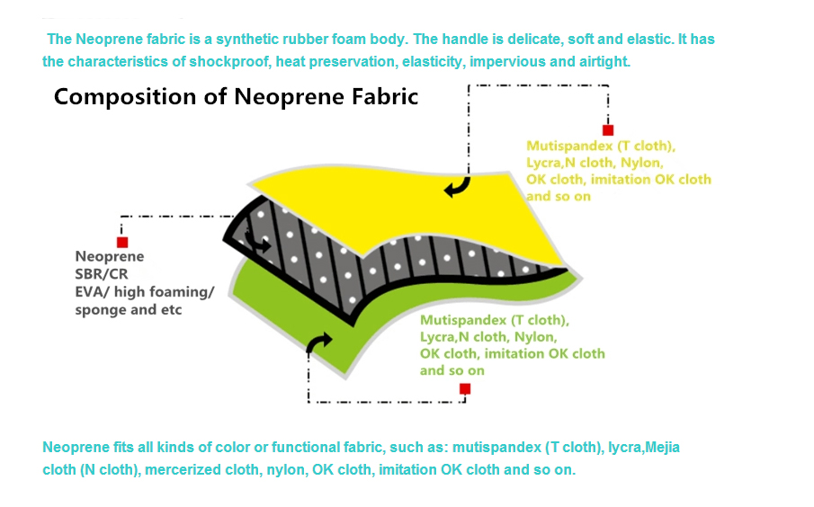 Summary of Neoprene(SBR CR ): Neoprene material is a kind of synthetic rubber foam, with delicate, soft, elastic, shockproof, heat-insulating, flexible, waterproof and breathable features. It is widely used in the manufacture of diving suits, so everyone got a plain name for it : Neoprene.