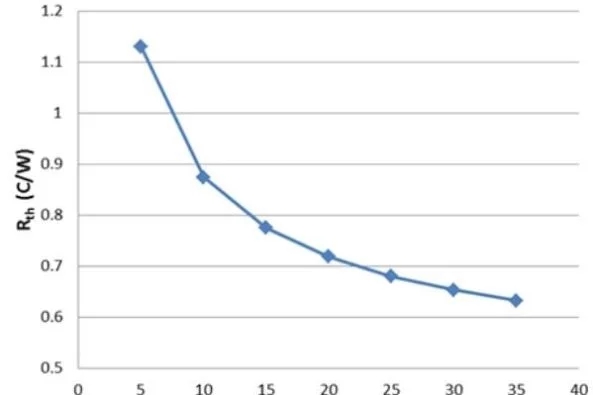Figure 2 shows the relationship between the size of the heat source and the thermal resistance of the heat sink under forced convection cooling. The dimensions of the heat sink are shown in Figure 1. The length of the heat sink is 76.2 mm, and the length and width of the heat source are the same and determined by Ls. The flow rate is 5 CFM, the heat emitted by the heat source is 59 W, and the ambient temperature is 30°C.