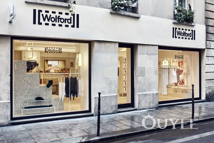 First of the Paris stores, located on Rue Vieille du Temple no. 36, immediately draws you inside with its unusual, glossy window display of bespoke rails wrapped around a terrazzo staircase. The small-scale, low-ceiling interior of this shop creates an unusual, cosy backdrop for Wolford’s world-famous hosiery.