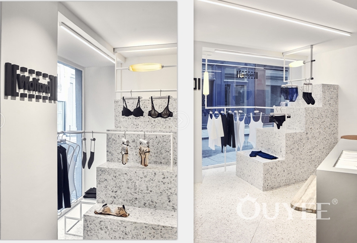 Inspired by Wolford’s industrial heritage and craftsmanship, interiors of both stores are elegant and rough at the same time. Colour and material palettes replicate the dreamy feel of the brand’s Austrian factory, where heavy machinery is always covered with soft fine netting to prevent the snagging of tights. Rails and spool-like lights bear a strong resemblance to the knitting machines, with ubiquitous powder coated steel finishes taken straight from the factory floor. The walls are raw or covered with unexpected building materials, such as acoustic wood or combed plaster with linear texture, which contrasts sharply with the refined and delicate garments on display.