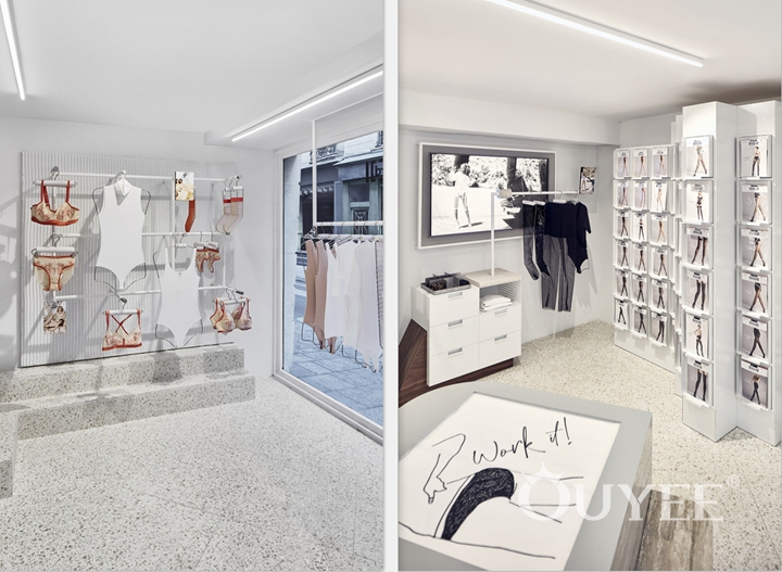 Despite their boutique sizes, both stores are playful and intimate; full of unexpected textures and hidden messages celebrating their unique Parisian locations. A subtle palette of muted white hues graduates from pure white metal, through creamy travertine and textured wood to fleshy, more feminine shades of purple and orange.