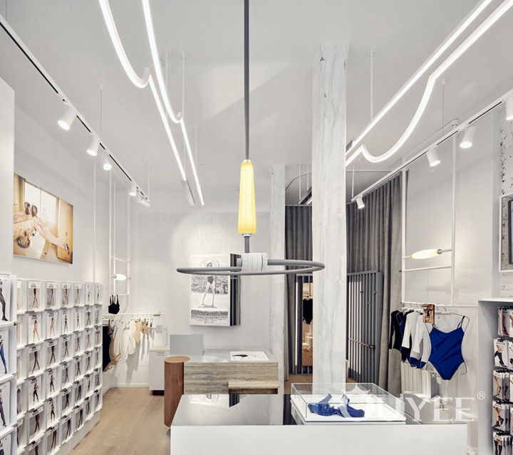 Customers are encouraged to find their own shade of nude, experiment and feel the fabric against their skin. The shape of the fixture is then repeated in the design of the cash desk. This minimal, high-end travertine element has a special inlay for wrapping paper, turning the transactional moment of payment into a special ritual connecting customers with the brand.