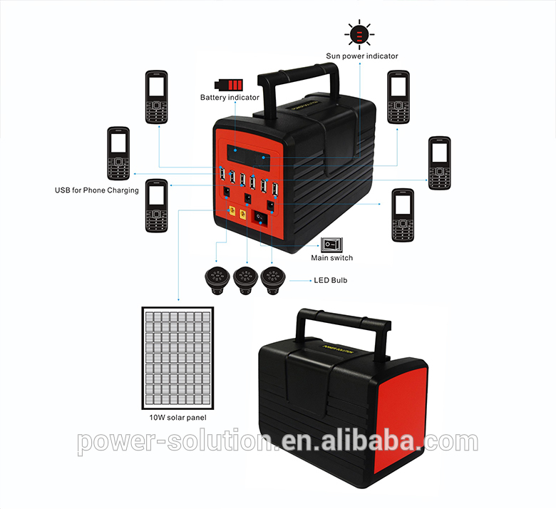 Usage : Lighting up 3 rooms , Charging 6 phones .