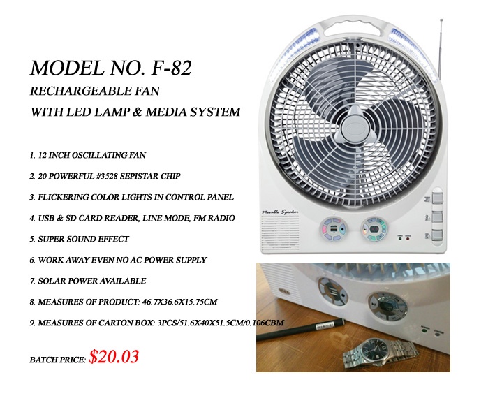 12 Inch Rechargeable Fan with LED Lamp & Bluetooth Media System