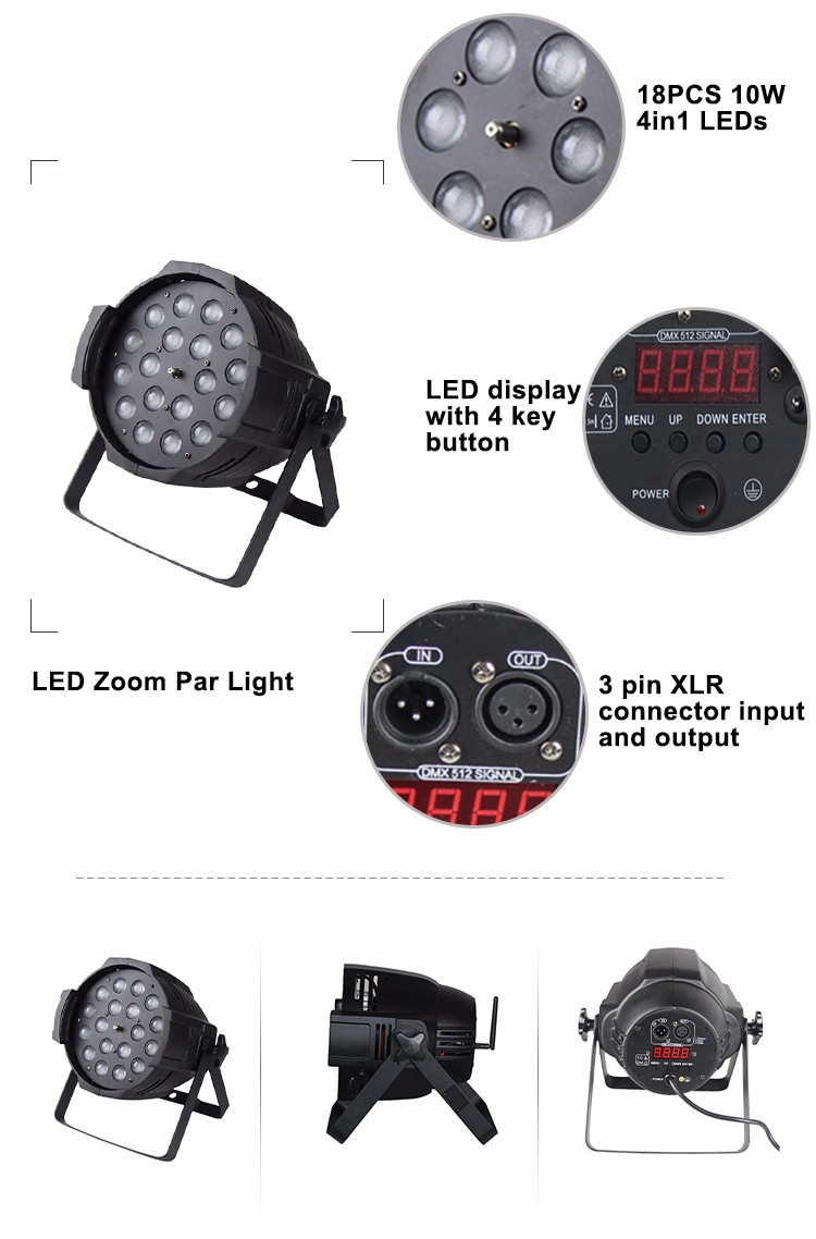 The LED-focusing lamp can be adjusted from 10° to 50° and uses 18 12W 5in1 LED beads. The product has high brightness, pure color mixing and no flicker. It combines the characteristics of dyeing lamp and beam lamp. This product is specially designed for outdoor, concert, mobile performance, night club, bar and so on.