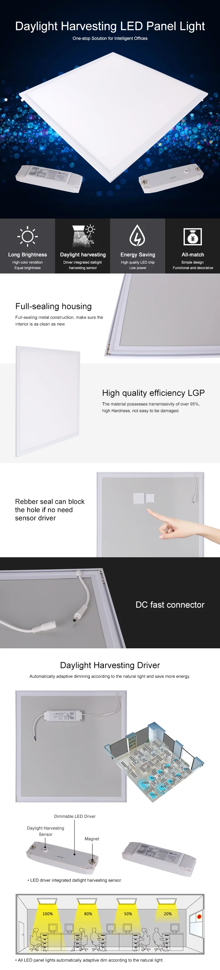 PLZ-DH LED Panel light • High efficiency & lower power consumption • Delivers high brightness & excellent illumination even in high ceiling areas • Combined with microwave occupancy sensor, daylight sensor and filcker-free dimmable LED driver • Automatically adaptive dimming according to the natural light and save more energy • Fiexible current settings loop-in/loop-out press fit terminal for fast installation • No UV or IR radiations