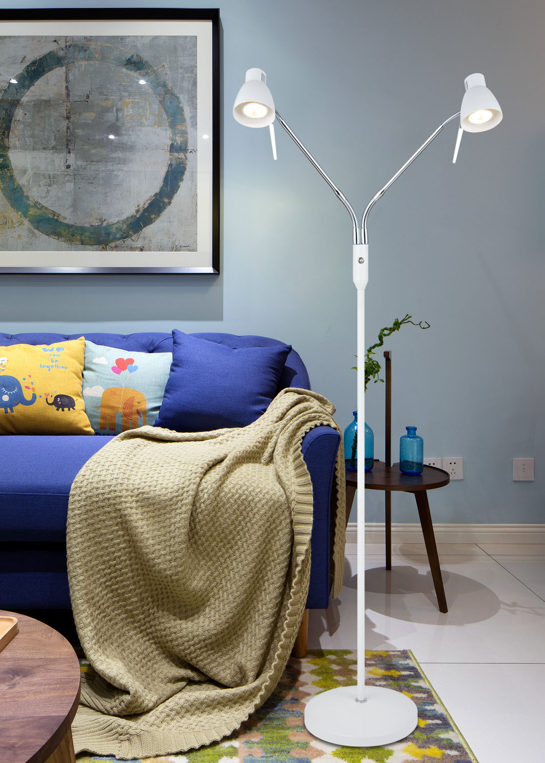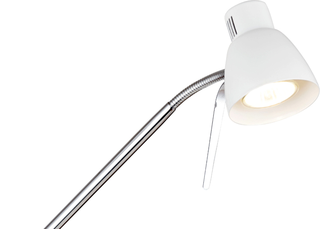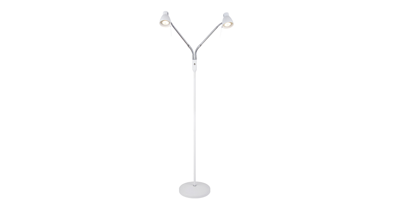 The double head floor lamp is made of iron, the main part of it is in white and chrome. The arms of the lamp can be adjusted at any angle. This floor lamp is also equipped with a dimmer, which you can dimming the light. It is suitable for bed rooms, living rooms, etc.