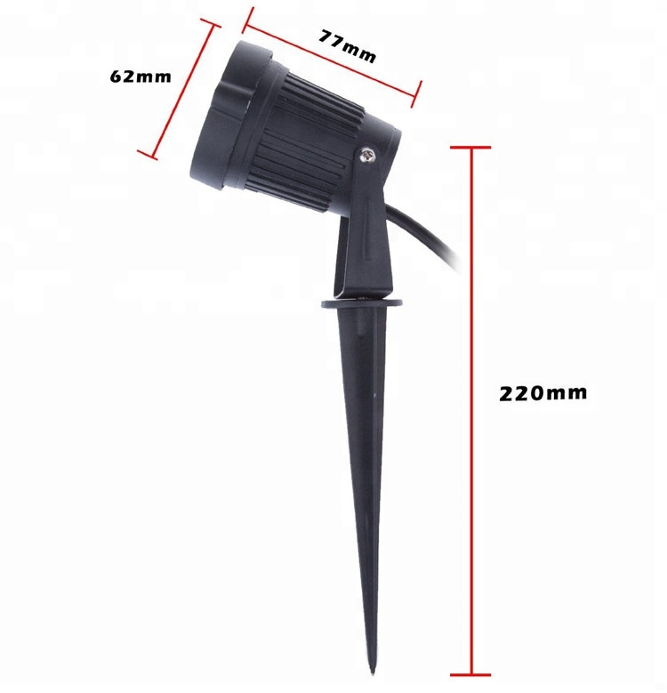 A 220mm the plant spike length, 77mm the led lamp length, 62mm the led lamp diameter. adjustable head LED garden spike light with a 2m power flex cord.