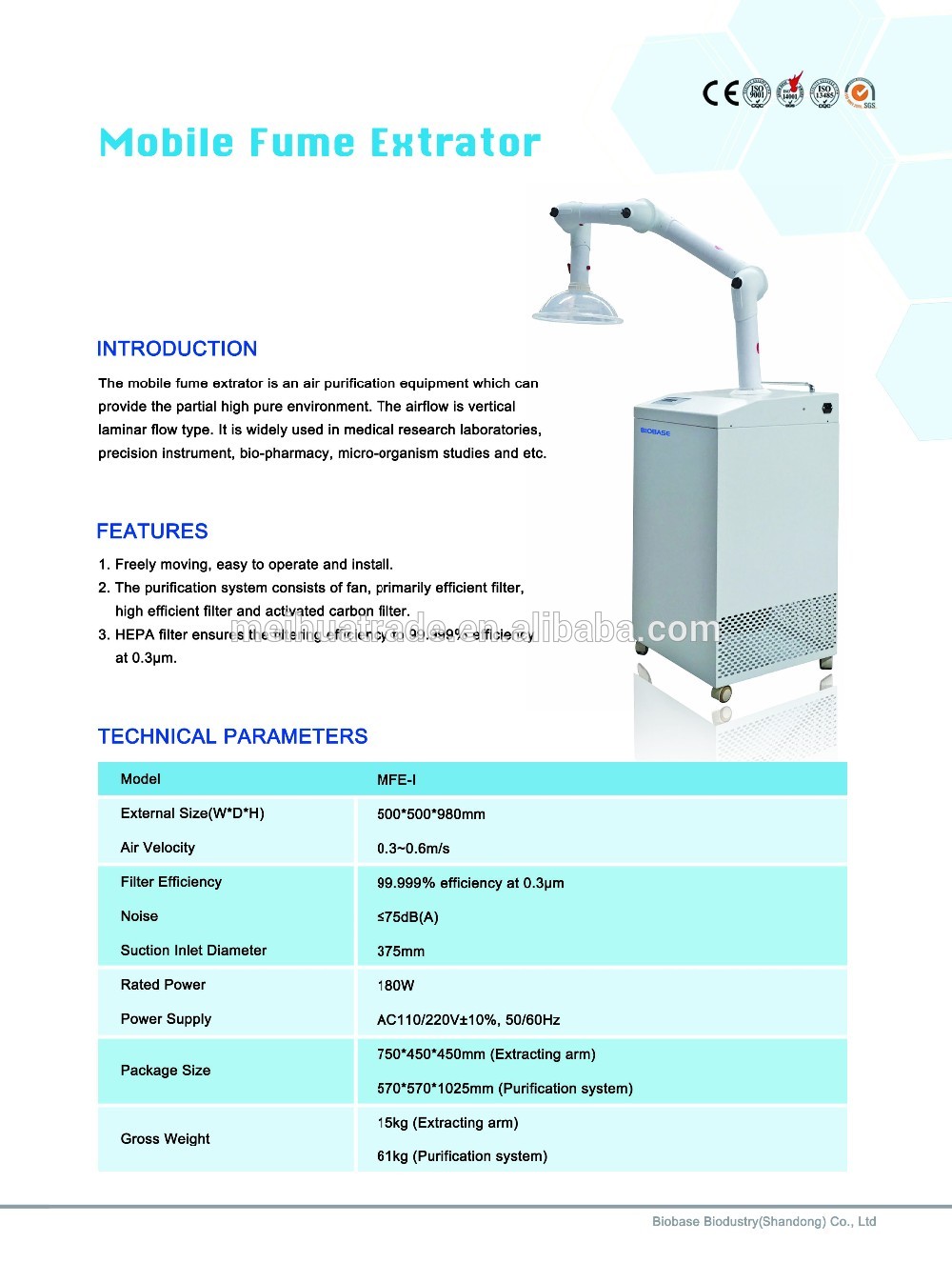 Parameters of MFE-I Medical Laboratory Mobile/Portable Welding Fume duct Extractor
