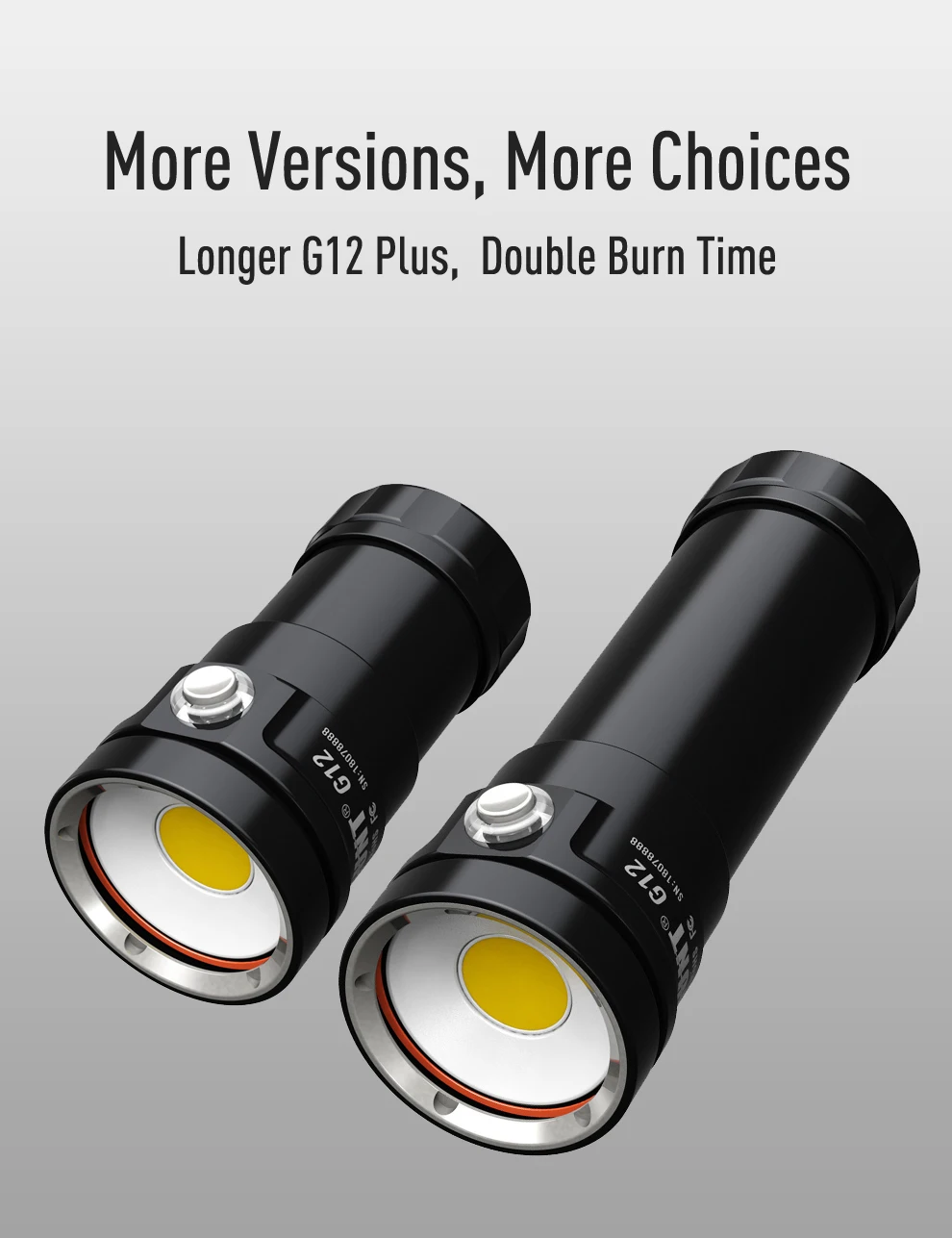 | [Packing List] | 1*G12/G12 Plus diving video torch light+1*power battery pack (4*18650/8*18650 batteries inside )+ 1*Charger+ 1*Ball mount +2*O-rings+ 1*Battery Protective Cover | |||||