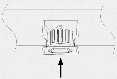 | To show above, make the spring clamp pull up, pushing spring tongue up next to the square hole wall, until the lamp panel close to the ceiling. | Here the installation is completed. When you want to regulation, please use hand hold the lamp, and push it up to complete the adjustment of need angle. |