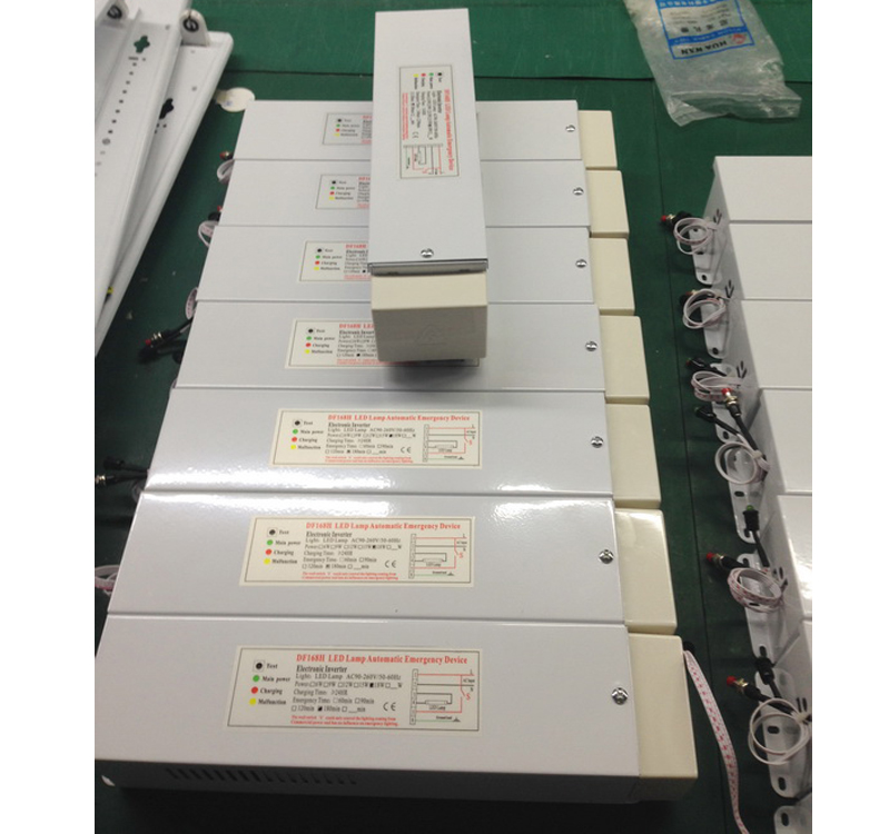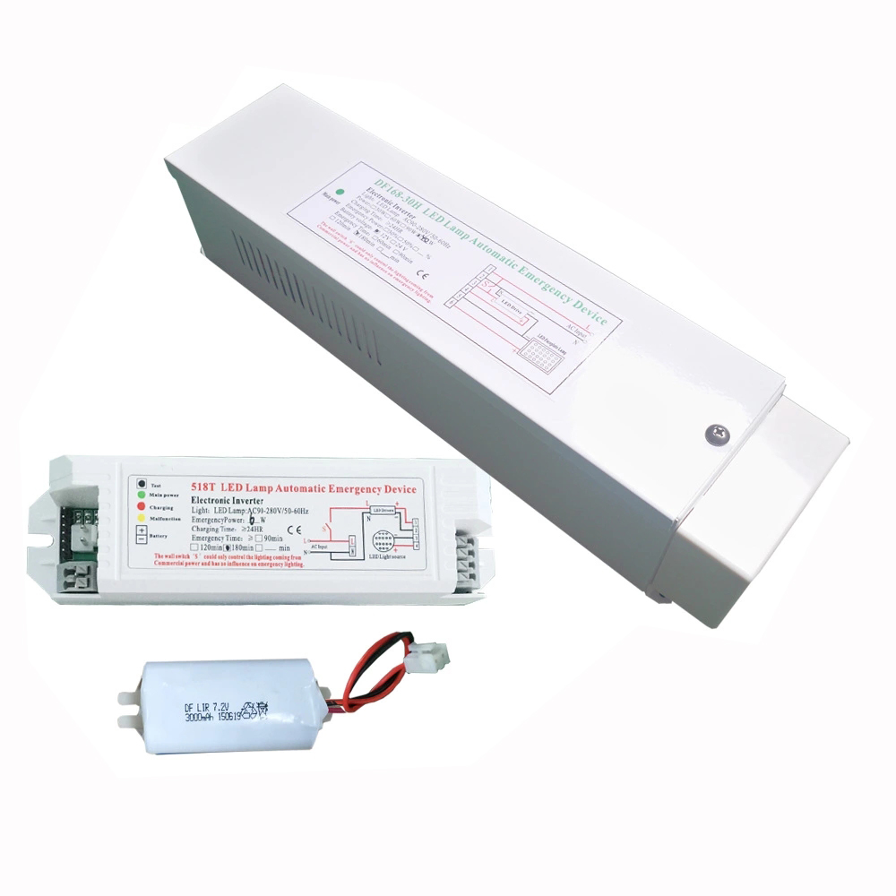 --- DF518T-1 20 Series are special design for US market which meet UL924 and CSAC22.2 Standards. --- DF518T-120 Series are used for different field installation and make the same LED lights to equiped w ith normal and emergency function.The DF518T-120 series input (120-277 V) emergency LED power kit works in conjunction with an AC LED driver that has an output current not to exceed 8 .0A.The emergency power k itis installed of a UL listed high-temperature Li-Ion battery and invertercircuitry in one red case. --- The Emergency power k itcan work on Max.200W light and output Max.28W for 90m ins. --- DF518T-120 Series built in strong IC for smart charing and d ischarging control,isolation circuit,and no-load protection fuction