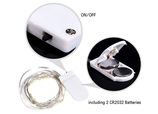 The Outstanding features of button battery case is small size so that easy to carry and hide the battery case when using it. The fairy lights battery operated with on/off switch, powered by 2 * CR2032 battery (included), the battery can be replaced easily.