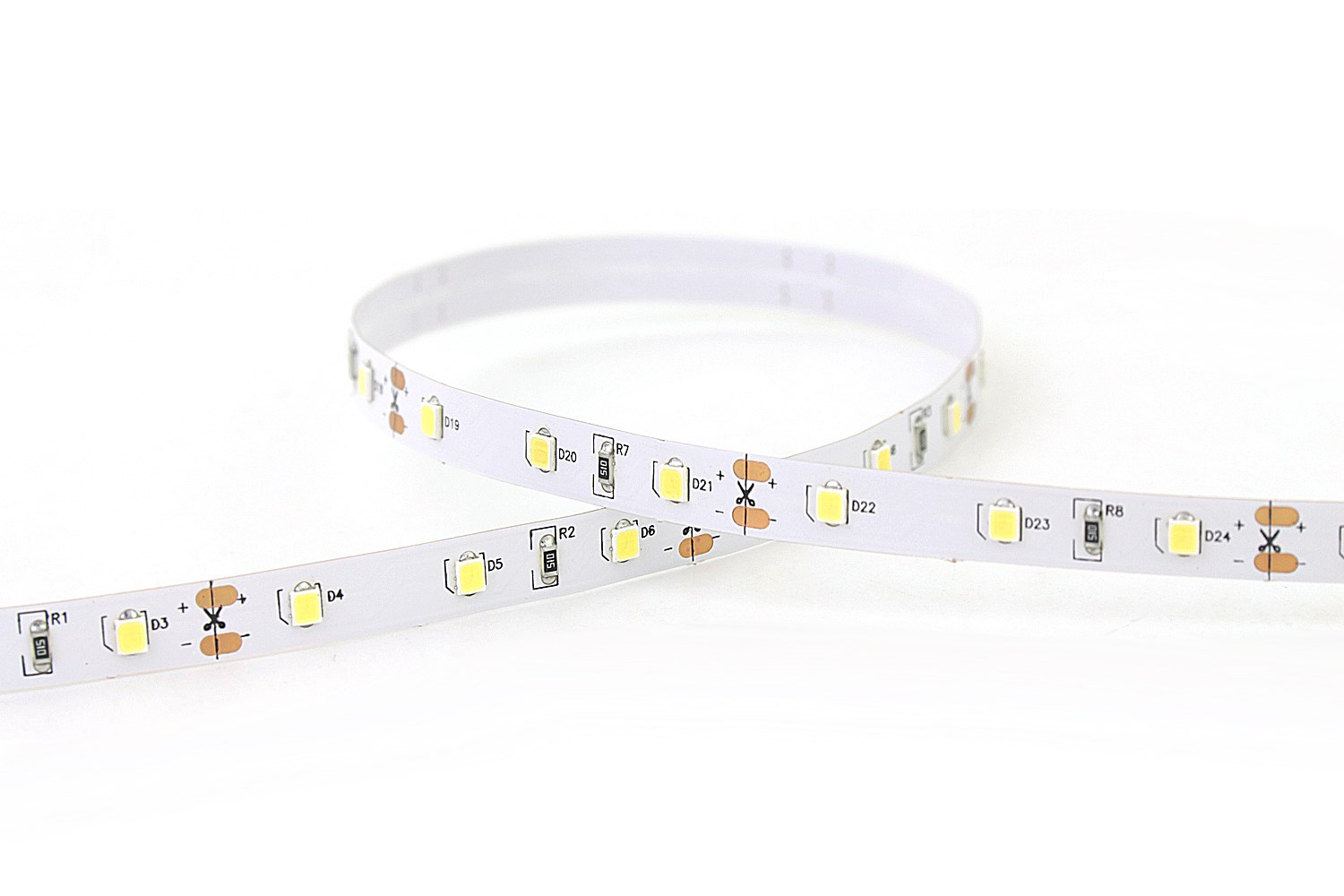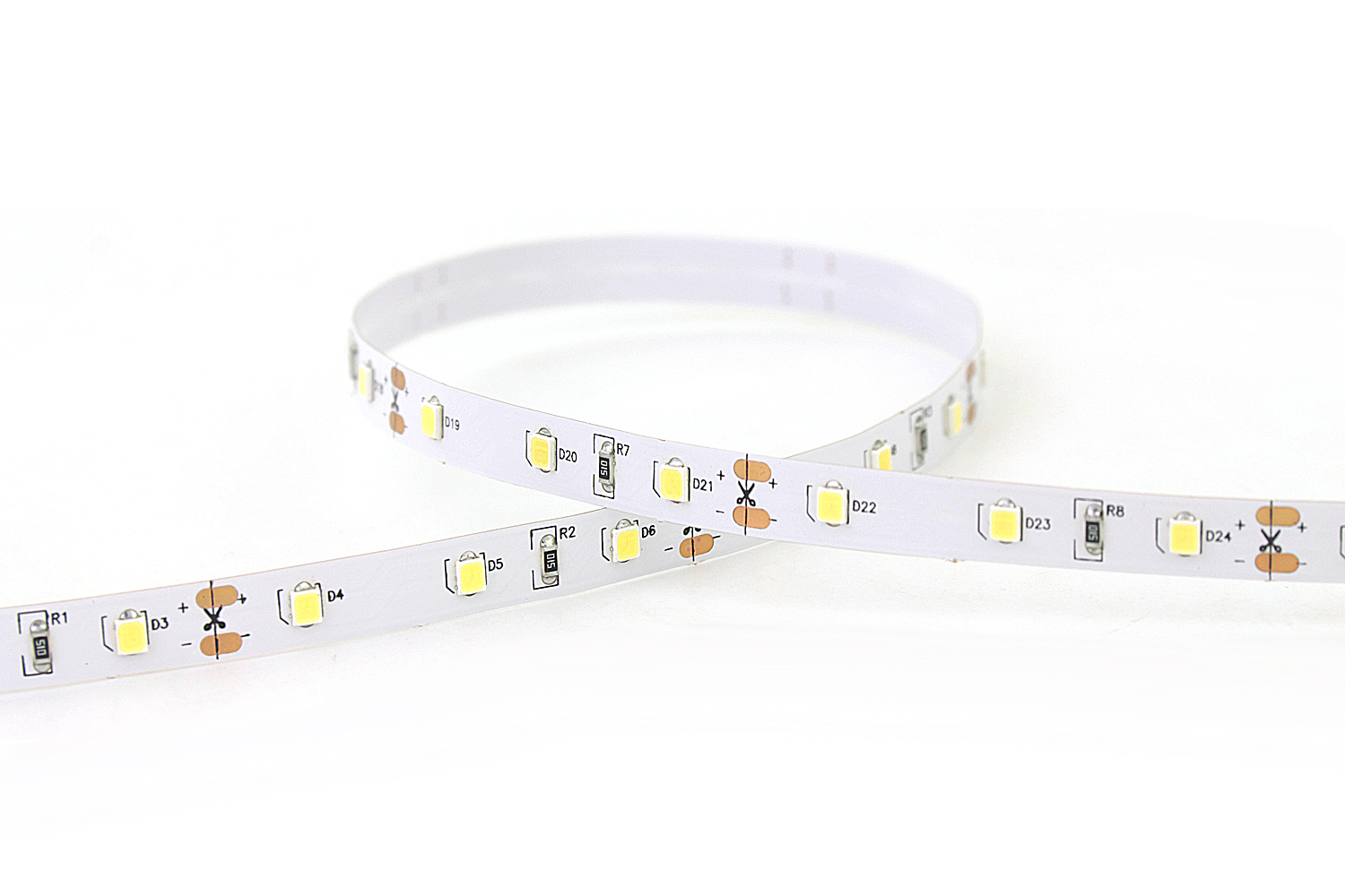 Flexible 16.4’ 35W 300 Diodes 2835 LED Strip Light - This versatile LED Strip light is in 7W/M (2.3 Watts/foot). It uses a 2835 LED Chip placed every 0.66”(16.6mm). This LED Strip has low Density Lighting with 60 didoes per meter or (18/ft).It is cuttable every 3 LED chips or 2”(50mm) for 12VDC and every 6 LED chips or 4”(100mm) for 24VDC. The pcb width of this led strip light is 8mm. It has a strong 3M adhesive tape backing on IP20 and IP65 strips that allows it to peal and stick to most surfaces. LED Strips will only achieve their maximum Lifetime installed in an Aluminum Profile to dissipate heat, protect them from elements, and create desirable lighting effects.