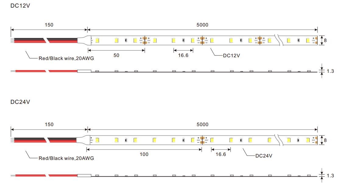 | LED QTY per meter | 100 | LED Strip dimension | 8mm (Width)*1.3mm(Height) |