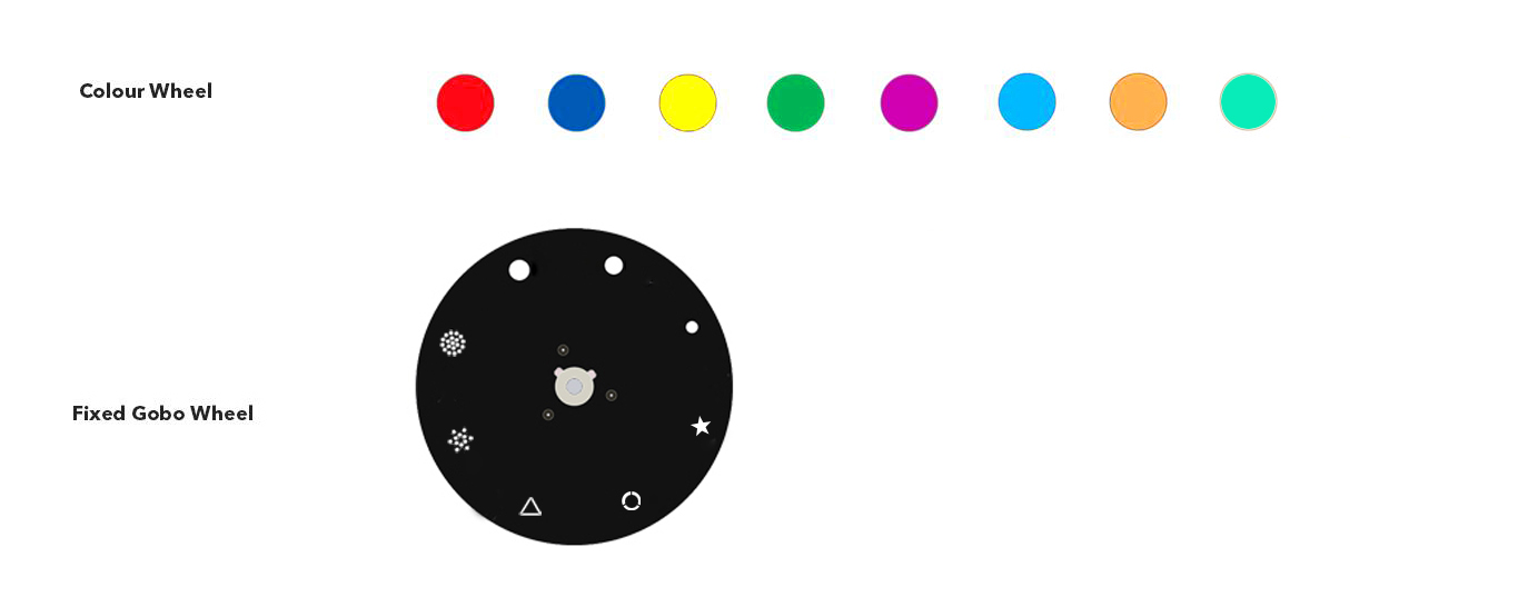 ※ EFFECTS ◈ 8-Facet Prism Effect With Speed Adjustable and Variable Direction ◈ Gobo Shaking, Color Changing, Prism Rotation, Focusing, Frost ◈ Strobe/ Pulse: 1-10 times/S ◈ Dimming: 0-100% Linear Electronic | ※ COLOR ◈ Color Wheel With 8 Diachronic Colors Plus Open ◈ Split Colors | ※ GOBOS ◈ Gobo Wheel ◈ Customizable/Fixed Gobos Plus Open |