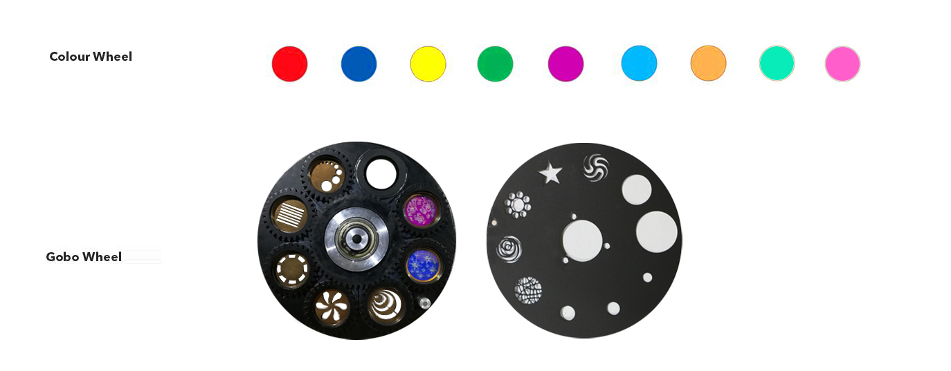 ※ EFFECTS ◈ 3-Facet Prism Effect, Prism Rotation Electric Focusing, Zoom in, Frost | ※ COLOR ◈ (1) Color Wheel With 9 Diachronic Colors Plus Open | ※ GOBOS ◈ (2) Gobo Wheels |