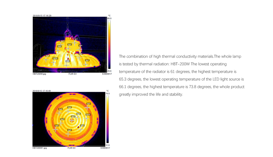 | Temperature on LED Max | 80W=61.9 °C;100W=64.9 °C (Test environment temperature 25 °C) | 130W=83.4 °C;150W=83.4 °C (Test environment temperature 25 °C) | 180W=78.8°C;200W=79.8 ° C(Test environment temperature 25 °C) |