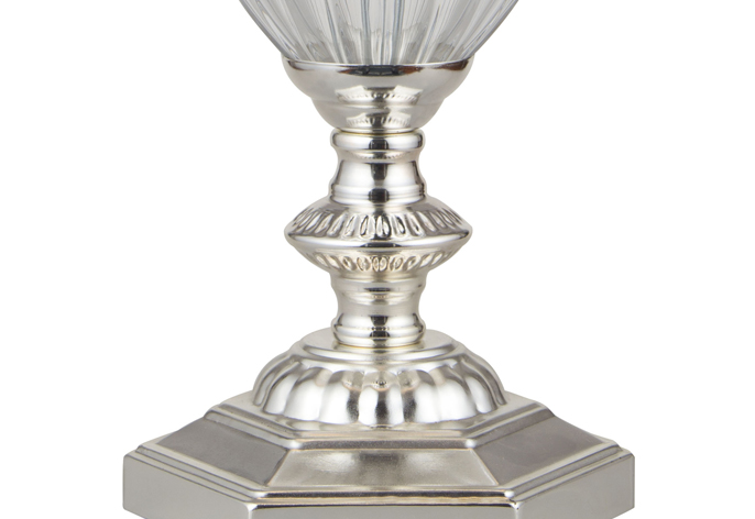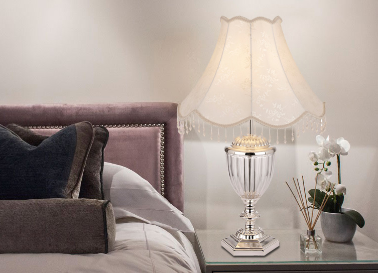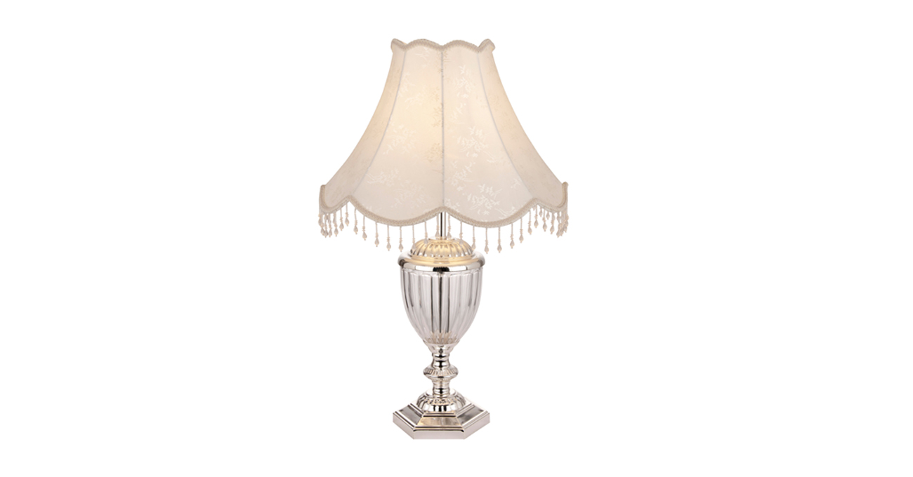 This table lamp is made of iron, cloth and crystal glass. The metal part of the lamp is silver electroplated, the crystal is transparent and the shade is beige. It equips with a switch on the cable. It is suitable for bed room, living room and so on.