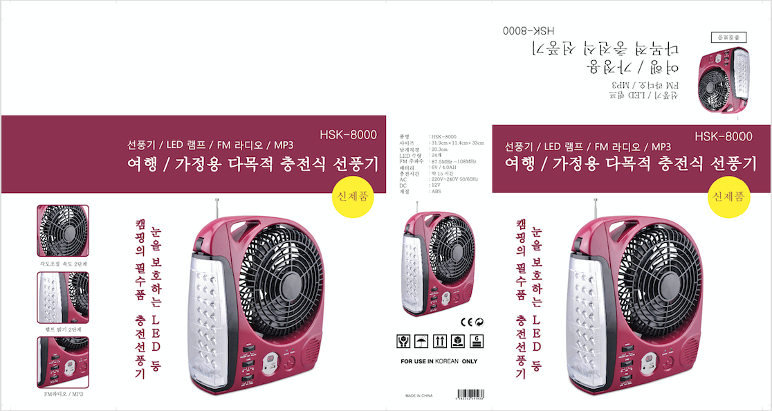 Detailed product description TYPE 8"" Rechargeable 2-Speed Multifunction Fan HOUSING MATERIAL Impact resistant ABS plastic BATTERY Built-in 6V 4500mAh lead-acid rechargeable battery OPERATION AC/DC operated VOLTAGE AC 110-240V FREQUENCY 50-60Hz DURATION 5 hrs/ High speed 10 hrs/ Low speed 2.5 hrs/ LED CHARGE TIME 8hours for charging full CHARGE INDICATOR YES OVERCHARGE AND OVERDISCHARGE PROTECTION FUNCTION YES CHARACTERISTIC 1.Rotatable 2.AM/FM Radio 3.AC/DC operation OTHERS 1.Rotation Angle:60 Degree 2.Any colors as you want for the housing 3.The Logo / Gift box / Carton box can be design for you. 4.Provide 0.5-0.8% spare part of all models.PACKING INFORMATION Size of item N.W G.W PCS/CTN 33x31.9x11.4cm 10.5kg 11.4kg 4pcs Size of carton 20"GP 40"HQ 53.4x35.3x37cm 1720pcs/430ctn 4000pcs/1000ctns