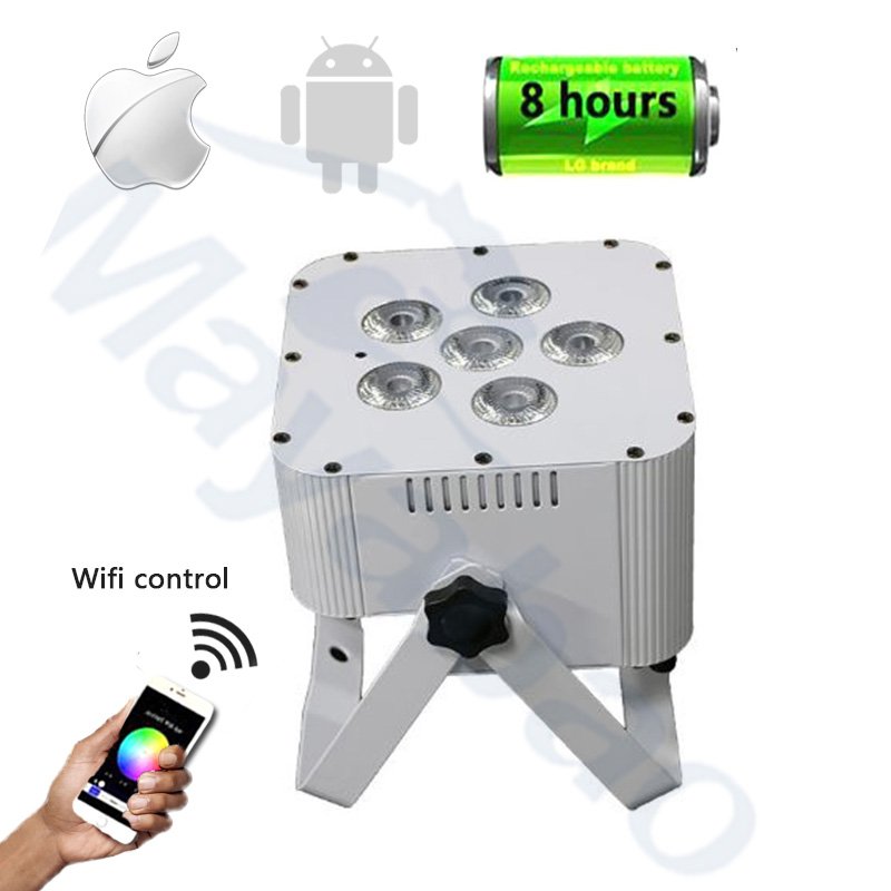 The wireless dj uplighting is a battery powered LED Par with SHU YANG’s WiFLY wireless DMX for indoor use. It’s powered by four 15W RGBAW+UV (6-IN-1) LEDs. The battery powered led par Series are lightweight and easy to operate with a scissors yoke for floor uplighting or mount on truss, the battery powered led par is useful for staging, events, productions and any mobile application. No cables or wires needed!
